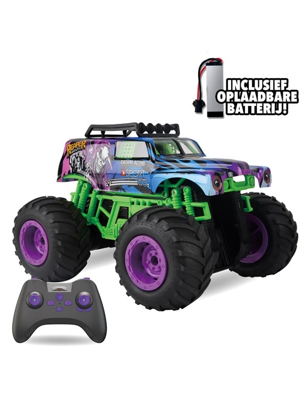 Gear2Play RC Monster Reaper er en cool, stuntman-monstertruck i skala 1:12. Takket være den kraftfulde motor kan denne bil nå hastigheder på op til 10 km/t. Med controlleren kan du styre denne monstertruck i alle retninger, og takket være det indbyggede g